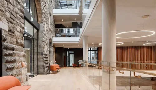 Light-Filled Contemporary Mezzanine With Striking Stone Façade for Executive Receptions