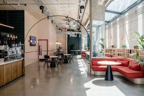 Industrial-style lounge in Dublin's Docklands designed for casual team gatherings, creative workshops, and after-work socials. The space accommodates up to 60 standing or 50 seated guests and showcases exposed red steel beams, polished concrete flooring, and... Show More