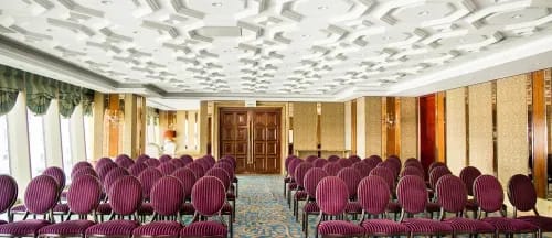 Elegant Ballroom With Gold Accents and Plush Carpeting for Engaging Events