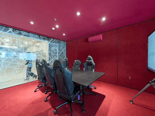 This vibrant red boardroom in Ho Chi Minh City is designed for high-focus meetings, workshops, and video conferences. Its bold red ceiling and carpet create an energetic, creative atmosphere, complemented by ergonomic racing-style chairs and a sleek black... Show More