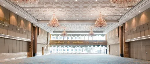 This grand ballroom is a masterpiece of timeless elegance, perfectly blending classic luxury with modern functionality. The space is designed with sophisticated architectural flair, highlighted by a stunning central chandelier that casts a warm golden glow.... Show More