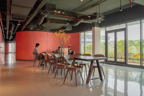 Contemporary workspace lounge in Ho Chi Minh City designed for workshops, networking sessions, and team off-sites. Its vivid red walls and sleek open layout create an energising environment for collaboration and creative thinking. The area transitions easily... Show More