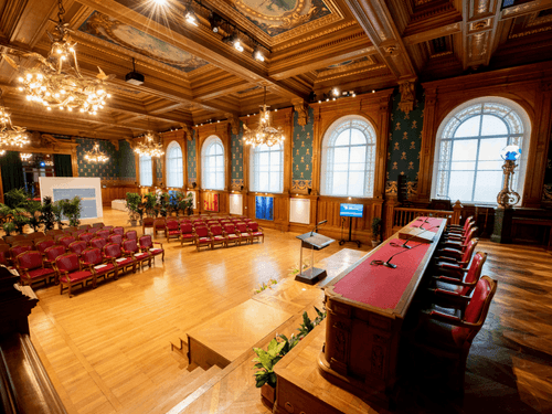 This neoclassical 480 m² conference hall in Monaco blends historic architecture with modern event facilities. Distinguished by carved wood panelling, a coffered ceiling, and gold chandeliers, the hall also features arched windows that fill the space with... Show More