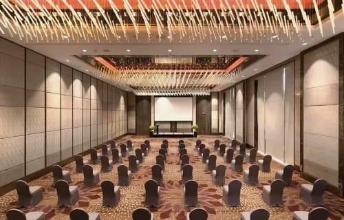 This contemporary ballroom is designed for conferences, presentations, and large-scale corporate events. A ceiling-wide installation of gold pendant lighting establishes a strong architectural identity, complemented by panelled walls and a restrained material... Show More