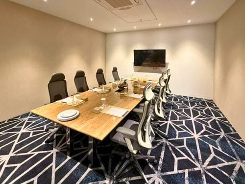 This intimate executive boardroom provides a professional yet comfortable environment ideal for small team meetings and focused discussions. A spacious wooden conference table and ergonomic high-back chairs ensure a productive and comfortable setting.The... Show More