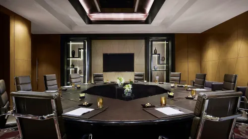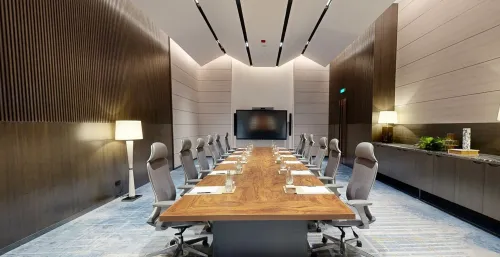 This executive boardroom is designed for strategy meetings, presentations, and private corporate discussions. Wood-panelled walls and a coffered ceiling detail establish a structured architectural setting with a formal, controlled atmosphere.The central... Show More