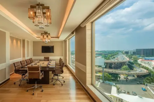 This city view executive boardroom provides a refined and professional setting for high-level meetings, client discussions, and strategic sessions. Floor-to-ceiling windows bring in natural daylight while offering views across the surrounding city, creating a... Show More