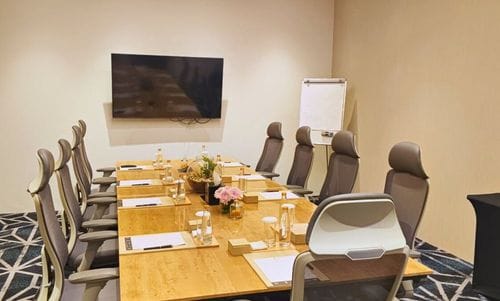 This polished wood meeting room offers a refined contemporary setting for workshops, presentations, and corporate sessions. Warm wood finishes and ambient lighting create a comfortable yet professional environment, designed to support focus and productivity.A... Show More