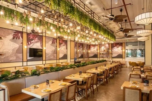 This design-led contemporary restaurant blends clean structural lines with warm materials to create a polished setting for stylish gatherings. Black steel arch frameworks define the space, while wood finishes, cane detailing and layered lighting establish a... Show More