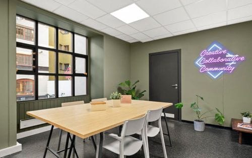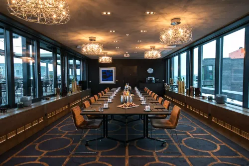 This meeting space exudes modern elegance with a refreshing splash of colour. The room boasts a minimalist architectural style, characterised by clean lines, large windows, and abundant natural light that creates an inviting atmosphere. The carefully curated... Show More