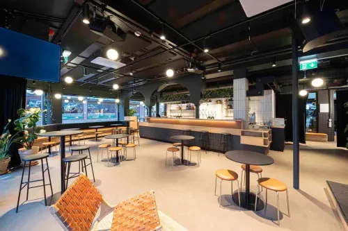 This vibrant urban venue is a masterpiece of contemporary industrial design, seamlessly blending modern aesthetics with an inviting and functional layout. The architectural style features exposed structural elements, dark ceilings with industrial lighting... Show More