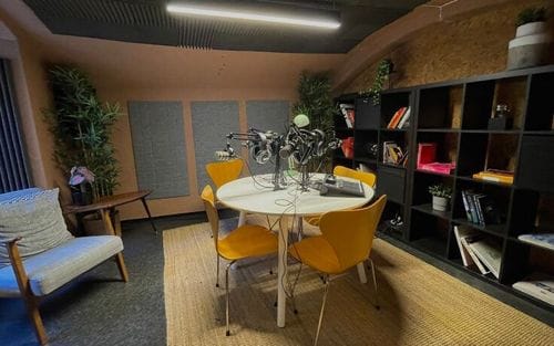 This intimate and well-designed podcast studio blends functionality with modern aesthetics, creating an ideal audio and video content creation environment. The architectural style is contemporary with a focus on acoustics and soundproofing. With its earthy... Show More