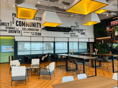 Step into a venue that perfectly encapsulates modern dynamism and creative energy. This spacious co-working hub features a striking combination of contemporary architecture with bold, geometric lighting fixtures that add a touch of futuristic flair. The... Show More
