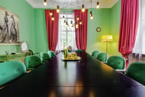 Tired of uninspiring meeting spaces? Step into this striking boardroom, where bold aesthetics meet refined sophistication. With its Art Deco influences, this venue blends lush green tones with deep red velvet curtains, exuding an atmosphere of creativity and... Show More